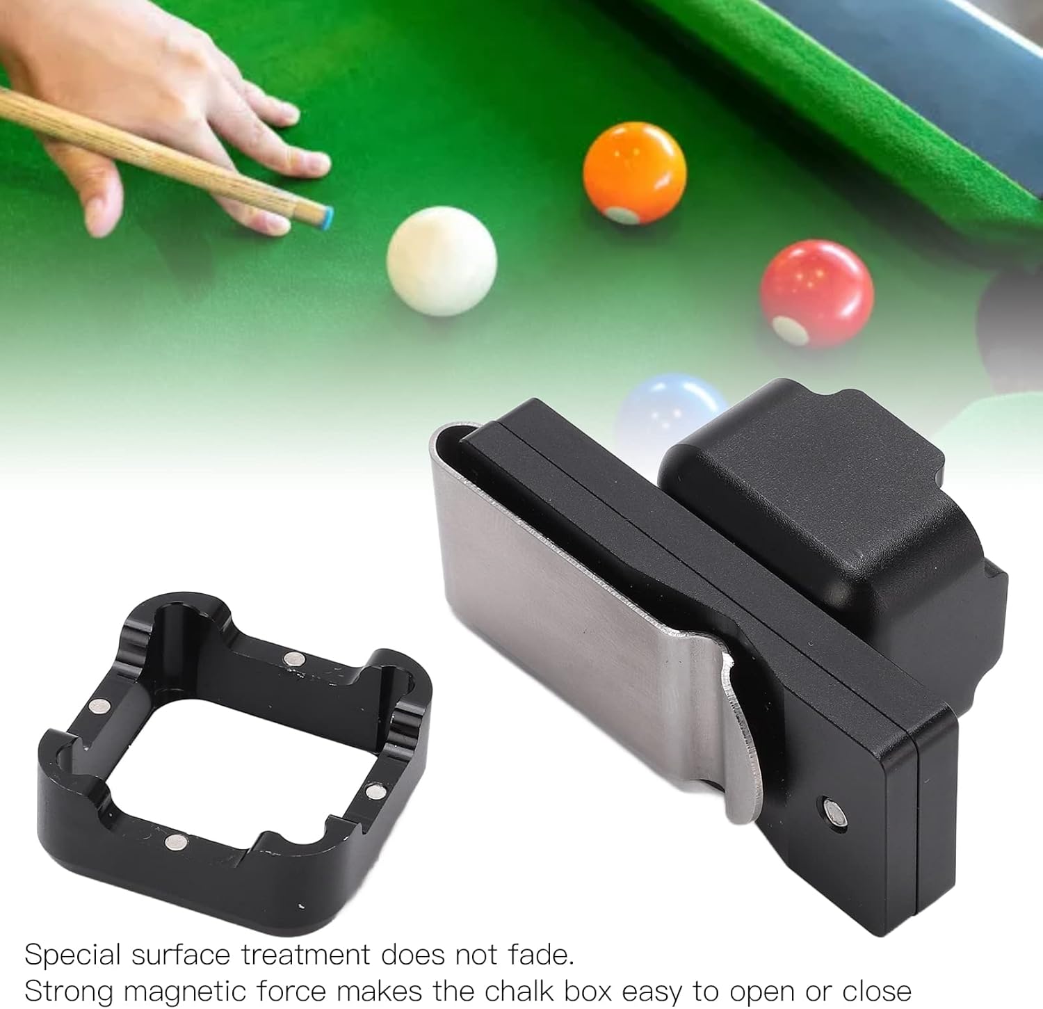 Description:This premium chalk set is crafted from high-quality aluminum alloy, ensuring it is lightweight, wear-resistant, and with a long lifespan. The smooth, burr-no surface prevents any scratches on your hands. The elegant design features a special surface treatment that keeps the color vibrant and prevents fading. The magnetic closure ensures easy opening and closing while protecting the chalk from and avoiding a mess in your pocket. The upgraded chalk clip is designed to reduce friction, eliminate noise, and prevent scratches. Portable and convenient, this chalk set is the accessory for snooker and billiard players.Specifications:Item Type: Billiard Chalk Case and ClipMaterial: Aluminium AlloyProduct Color: BlackChalk Clip: 57x25mm / 2.2x1.0inChalk Case: 30x30x30mm / 1.2x1.2x1.2inProduct Weight: Approx. 89g / 3.1ozPackage List:1 x Snooker Chalk Clip1 x Billiard Chalk Case1 x Metal PatchNote:1. Please allow 1‑3mm error due to manual measurement. Thanks for your understanding.2. Monitors are not calibrated same, item color displayed in photos may be showing slightly different from the real object. Please take the real one as standard.