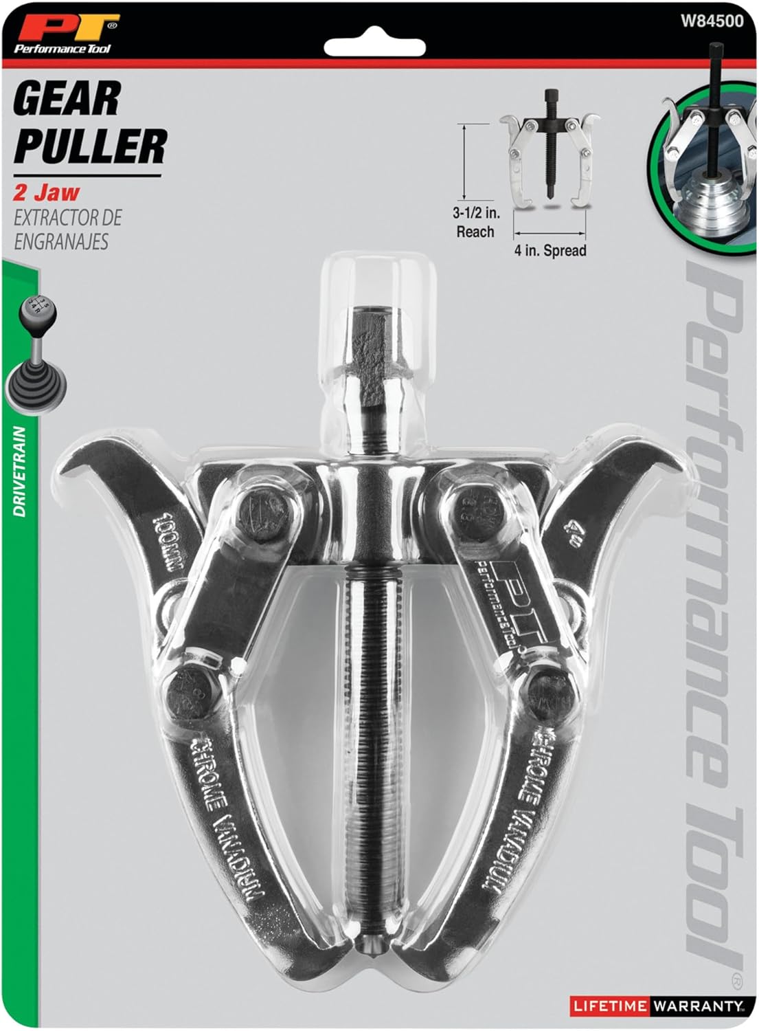 The Performance Tool 4-Inch 2 Jaw Gear Puller is a durable and versatile tool designed for use in a variety of applications. Made from heat-treated alloy steel and drop forged for strength, this gear puller is built to last. With a 4" spread and 3-1/2" reach, it is perfect for removing gears, pulleys, and flywheels. The chrome-plated finish provides an extra layer of protection against corrosion and wear, ensuring a long lifespan. The 2 jaw design makes it easy to attach and remove from your gear, pulley, or flywheel with minimal effort. This versatile tool can be used for a variety of jobs, from automotive repair to industrial maintenance, making it an essential addition to any toolbox.