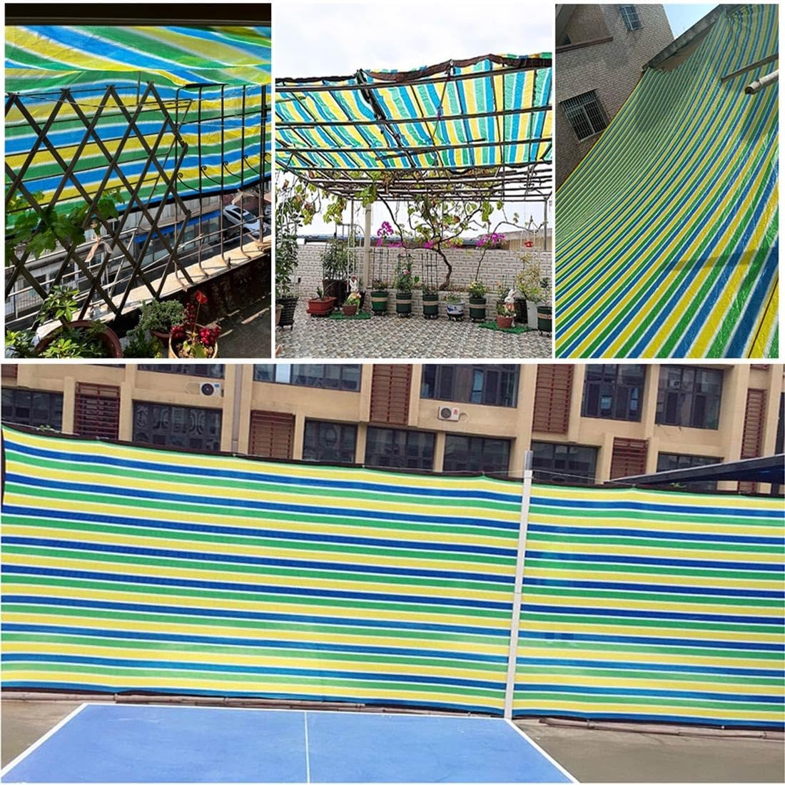 Our premium Shades Cloth, designed to keep you and your spaces shaded, protected, and cool. Product specifications:- Name: Shade Cloth - Multi-Purpose 80% Shading Net- Material: High-Density Polyethylene (HDPE)- Color: 4-color stripes pattern (Green + Yellow + Blue + White)- Weight: 110g/m² (0.24lb/m²)- Grommet Spacing: 100cm/39in/3.28ft- 73 Sizes: Size can be customized(Note: Actual dimensions are approximately 10cm/3.9in smaller than listed due to stitching.)Widths include: 5ft, 10ft, 15ft, 20ft, 25ft, 30ft, 35ft, 40ftLengths include: 5ft, 10ft, 15ft, 20ft, 25ft, 30ft, 35ft, 40ft, 45ft, 50ft, 55ft, 60ft, 65ft, 70ftFeatures:- UV Protection: Blocks 80% of harmful UV rays while promoting a healthy environment for your plants to thrive.- Easy to use: Equipped with metal grommets spaced every 100cm for effortless hanging and stability.- Reinforced Edging: The 6-line black edging prevents tearing, ensuring longevity and durability in all weather conditions.- Versatility: Ideal for multiple uses—from protecting garden beds and patio areas to providing shelter for pet houses and pools.- Water-Friendly: Designed to drain rainwater efficiently, keeping your areas free from excess water while maintaining moisture for your plants.Package include:1 x Color striped sunshade Cloth1 x RopeImportant Notes:- How to open: Do not open the package with a knife. To prevent the Shade net from scratching.