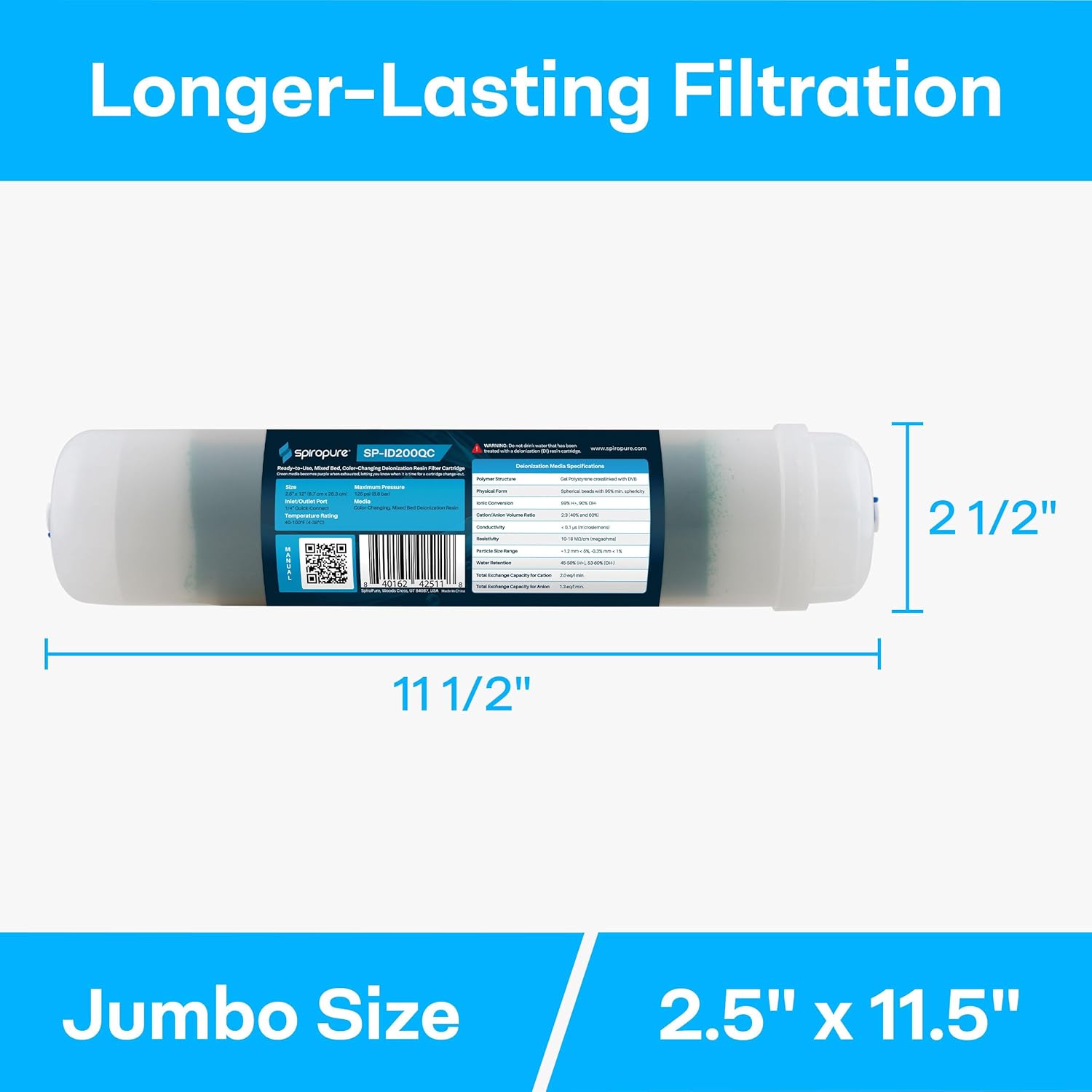 The SpiroPure SP-ID200QC inline deionizing water filter cartridge offers ready-to-use mixed-bed indicator resin for water that is practically free of ions and chemically purified. Indicator color-changing resin changes from green to purple to let you know it is time to change your filter cartridge. This cartridge is a jumbo, 2.5” x 11.5” inline cartridge for longer resin life and 1/4"" quick-connect fittings for faster install.WARNING: Do not drink water that has been treated with a deionization (DI) resin cartridge.